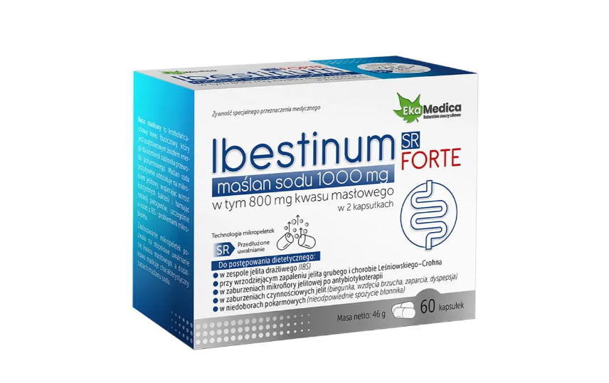 Когда следует принимать Ибестинум ФОРТЕ СР 1000 мг бутирата натрия? Препарат применяется для диетического лечения в следующих случаях: синдром раздражённого кишечника (СРК), язвенный колит и болезнь Крона. Нарушения кишечной микрофлоры после антибиотикотерапии. Функциональные расстройства кишечника ( диарея , запор , метеоризм , несварение желудка). недостаточное потребление пищевых волокон . Данный продукт следует применять под наблюдением врача. Он не подходит для использования в качестве единственного компонента рациона питания. Почему стоит выбрать Ибестинум Форте SR бутират натрия в капсулах – EkaMedica? Продукты питания для специальных медицинских целей. Подходит для взрослых и детей старше 7 лет. Каждая капсула содержит 500 мг бутирата натрия, включая 400 мг масляной кислоты (80%). Технология микрогранул SR (Sustained Release) обеспечивает постепенное высвобождение активного вещества в кишечнике. Высокая эффективность и лучшая переносимость благодаря снижению характерного запаха бутирата натрия. Масляная кислота – свойства Масляная кислота — это короткоцепочечная жирная кислота, которая служит основным источником энергии для эпителиальных клеток кишечника. Она оказывает положительное воздействие на микробиом кишечника, поддерживая рост полезных бактерий и подавляя развитие патогенов, особенно у людей с синдромом раздраженного кишечника и проблемами с микробиомом. Ekamedica Ibestinum Forte SR содержит бутират натрия в виде микрогранул с замедленным высвобождением, благодаря чему активный ингредиент постепенно высвобождается в пищеварительном тракте, что повышает его эффективность и биодоступность.
