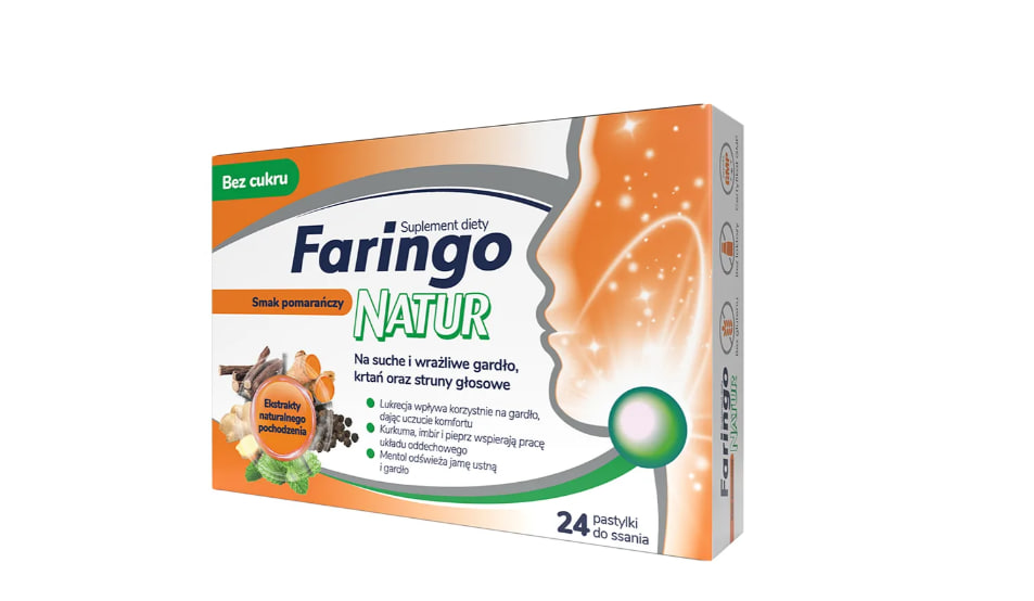 Описание продукта FaringoNatur — это пищевая добавка в форме леденцов со вкусом апельсина, предназначенная для использования взрослыми и детьми старше 6 лет. FaringoNatur – откройте для себя преимущества Подходит для взрослых и детей старше 6 лет. с апельсиновым вкусом, Не содержит сахара, глютена и лактозы. Имеет сертификат GMP. В состав леденцов входит тщательно отобранный набор экстрактов природного происхождения: плоды черного перца, корневище куркумы, корневище имбиря, корень солодки и ментол.
