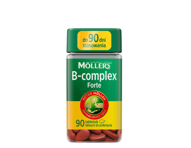 Данный продукт может использоваться в качестве добавки к ежедневному рациону взрослых, в том числе тех, кто хочет поддержать, среди прочего, правильное функционирование нервной системы¹ , уменьшить чувство усталости² и сохранить здоровье кожи³ и волос⁴ . Витаминный комплекс группы В – для чего он нужен? Витамины группы В играют важную роль в правильном функционировании организма взрослого человека: 1. Поддерживает правильное функционирование нервной системы (тиамин, рибофлавин, ниацин, биотин, витамины B6 и B12). 2. Они способствуют снижению усталости и утомления (рибофлавин, ниацин, фолаты, пантотеновая кислота, витамины B6 и B12). Они помогают поддерживать нормальные психологические функции (тиамин, ниацин, биотин, фолаты, витамины B6 и B12). Они способствуют поддержанию нормального энергетического обмена (тиамин, рибофлавин, ниацин, биотин, пантотеновая кислота, витамины B6 и B12). Они поддерживают правильное функционирование иммунной системы (витамины B6, B12 и фолаты). Они помогают защитить клетки от окислительного стресса (рибофлавин). 3. Способствует поддержанию здоровья кожи (рибофлавин, ниацин, биотин). 4. Способствует поддержанию здоровья волос (биотин). Они играют роль в поддержании надлежащего состояния слизистых оболочек (рибофлавин, ниацин, биотин). Они участвуют в поддержании нормального зрения (рибофлавин). Они способствуют правильному образованию красных кровяных клеток (витамины B6 и B12). Почему стоит выбрать таблетки B-комплекса Forte от Mӧller's, 90 штук? Удобная добавка – всего 1 таблетка в день. Полный набор из 8 витаминов группы В в одной таблетке. Таблетки в форме ямки , которые легко проглотить. Упаковка рассчитана на 90 дней ежедневного использования. Для достижения заявленного положительного эффекта принимайте по 1 таблетке в день . Упаковка содержит 90 таблеток и , согласно рекомендациям производителя, обеспечит одного человека ежедневным приемом добавки в течение 3 месяцев .