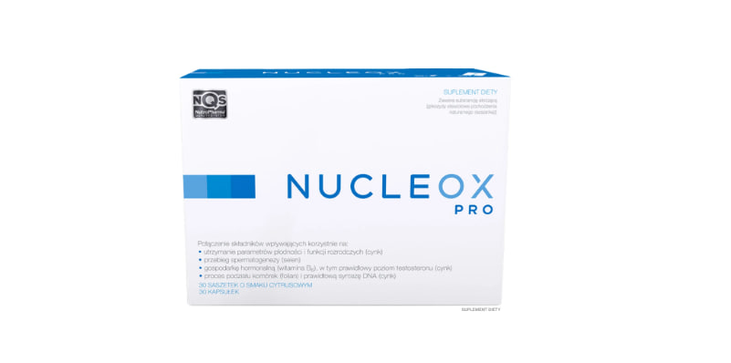 Описание продукта Nucleox Pro — это комплексная пищевая добавка, разработанная специально для взрослых мужчин . Она выпускается в форме 30 пакетиков порошка со вкусом лимона для приготовления напитка и 30 капсул . Капсулы следует принимать вместе, что облегчает поддержание полноценного ежедневного приема добавки. Каждый пакетик содержит 150 мг инулина цикория, 2 г L-карнитина и 75 мг витамина С. Каждая капсула обеспечит организм 200 мг N-ацетил-L-цистеина (NAC), 10 мг витамина В6, 400 мкг фолиевой кислоты в форме L-метилфолата кальция , 15 мг цинка, 60 мкг селена и 150 мг битартрата холина. Nucleox Pro – состав и свойства Цинк помогает поддерживать нормальную фертильность, репродуктивную функцию и уровень тестостерона в крови. Он также способствует нормальному синтезу ДНК. Селен способствует правильному протеканию сперматогенеза. Витамин B6 способствует регуляции гормональной активности. Фолаты участвуют в процессе деления клеток и помогают поддерживать нормальный метаболизм гомоцистеина. Холин способствует поддержанию нормального метаболизма гомоцистеина. Витамин С помогает защитить клетки от окислительного стресса и способствует нормальному энергетическому обмену. L-карнитин — это химическое соединение, синтезируемое из двух аминокислот: лизина и метионина. N-ацетилцистеин (NAC) — это высокоактивная с биологической точки зрения форма L-цистеина. Цистеин — это органическое химическое соединение из группы эндогенных белковых аминокислот. Вместе с гомоцистеином и метионином он образует группу серосодержащих аминокислот. Ацетильное производное цистеина, NAC, является предшественником синтеза глутатиона, который концентрируется преимущественно в печени.