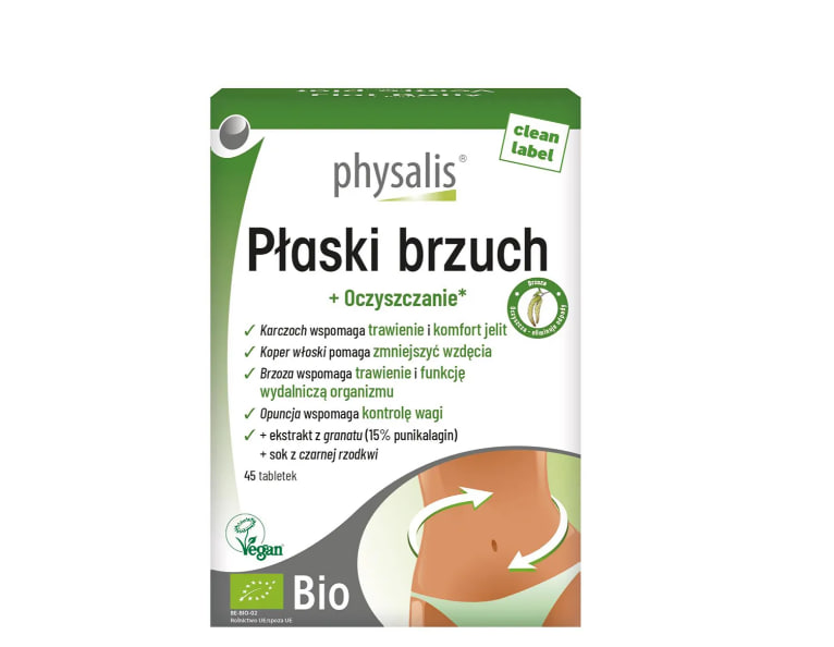 Описание продукта Physalis Flat Belly Bio — это пищевая добавка, содержащая комплекс высококачественных органических растительных экстрактов, разработанная специально для взрослых. Формула продукта сочетает в себе экстракты артишока, фенхеля, опунции, березы, граната и черной редьки , дополняя ваш ежедневный рацион растительными ингредиентами. В состав препарата входят экстракты растений, выращенных по органической системе. Артишок может способствовать поддержанию здоровой функции печени, включая ее естественные детоксикационные функции. Кроме того, он поддерживает правильное пищеварение и здоровье кишечника, играя роль в нормальном функционировании пищеварительных соков. Экстракт фенхеля поддерживает аппетит и пищеварение, способствуя правильному функционированию пищеварительного тракта, а также оказывает успокаивающее действие при метеоризме и спазмах в животе. Опунция способствует снижению веса , помогает контролировать уровень глюкозы и снижает аппетит. Она также способствует метаболизму жиров, что помогает контролировать вес.