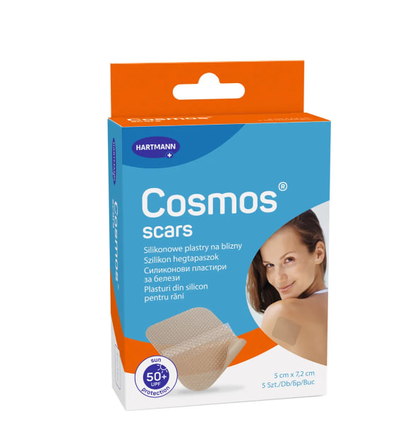 Описание продукта Силиконовые пластыри Cosmos Scars от рубцов — это медицинское изделие, разработанное для поддержки лечения свежих гипертрофических рубцов и предотвращения чрезмерного рубцевания. Пластыри изготовлены из тонкой полиуретановой (ТПУ) пленки с медицинским силиконовым гелем, эффективно защищающим кожу и поддерживающим процесс ее регенерации. Кроме того, они защищают рубцы от УФ-излучения ( SPF 50+), что крайне важно для правильного заживления. В упаковке содержится 5 пластырей размером 5 x 7,2 см и удобная коробка для хранения.