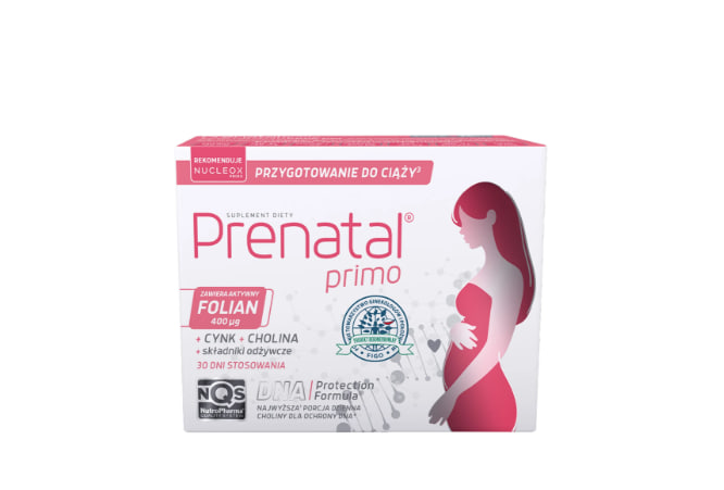 Препарат Prenatal ® Primo с формулой защиты ДНК содержит холин и FolActiv ® – комбинацию фолиевой кислоты (птероилмоноглутаминовой кислоты) и активной формы фолата – L-метилфолата кальция . Метилированный фолат при пероральном приеме не требует дополнительного метаболизма и может немедленно транспортироваться к клеткам-мишеням. Активная форма фолата особенно важна для женщин с замедленным метаболизмом фолиевой кислоты. Прием обеих форм фолата до и во время беременности является важным элементом профилактики дефектов нервной трубки, рекомендованным Польским обществом гинекологов и акушеров. Цинк способствует поддержанию нормальной фертильности и репродуктивных функций, что особенно важно на этапе, предшествующем оплодотворению. Витамин B12 играет роль в процессе деления клеток. В капсулах Prenatal® Primo используется метилB12 — метилированный витамин B12, считающийся его активной формой. Витамин D в рекомендуемой суточной дозе 2000 МЕ поддерживает нормальное функционирование иммунной системы. Он также важен для здоровья костей , зубов и правильной работы мышц. Йод способствует нормальной выработке гормонов щитовидной железы и её правильному функционированию. Он также играет важную роль в нормальном функционировании нервной системы и поддержании нормальной когнитивной функции. Почему важно принимать фолиевую кислоту до беременности? Добавки фолиевой кислоты повышают уровень фолиевой кислоты у матери. Низкий уровень фолиевой кислоты у матери является фактором риска развития дефектов нервной трубки у развивающегося плода. Положительный эффект достигается при ежедневном приеме 400 мкг фолиевой кислоты в течение как минимум одного месяца до зачатия и до трех месяцев после него. Фолиевая кислота также способствует росту тканей матери во время беременности. Она также способствует нормальному синтезу аминокислот и играет роль в нормальном кроветворении. Это питательное вещество также поддерживает нормальную функцию иммунной системы и способствует снижению утомляемости и утомляемости. Фолиевая кислота также участвует в процессе деления клеток. Планируя беременность, обратите внимание на Prenatal ® Primo, разработанный специально для периода до зачатия и во время него. Когда вы уже будете мамой, выберите Prenatal ® Uno – препарат, разработанный для матерей и их малышей до 12 недель беременности. Начните принимать Prenatal ® Duo с 13-й недели беременности и продолжайте до окончания грудного вскармливания. Приложение Пищевая добавка с активными ингредиентами препарата, подобранными с учетом периода подготовки к беременности.