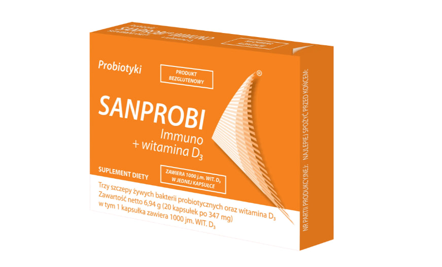 Описание продукта Sanprobi Immuno + Vitamin D3 — это пищевая добавка в капсулах. Ее формула сочетает в себе три штамма бактерий Lactobacillus и витамин D3.