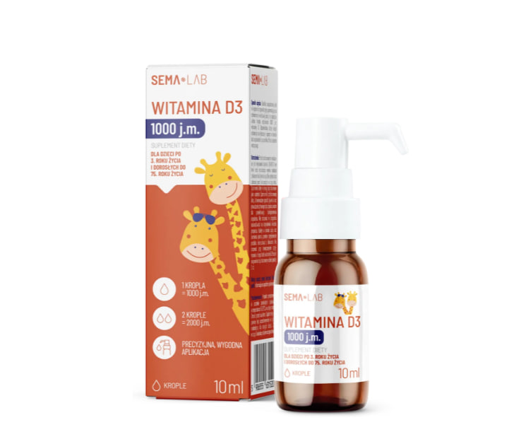 Описание продукта SEMA Lab Витамин D3 1000 МЕ для детей от 3 лет и взрослых — это пищевая добавка в форме капель, предназначенная для дополнения ежедневного рациона. Каждая капля содержит 25 мкг витамина D. Свойства витамина D в каплях Витамин D необходим для правильного роста и развития костей у детей . Он также поддерживает правильное функционирование иммунной системы организма с раннего возраста. Витамин D также способствует правильному усвоению кальция и фосфора и поддержанию нормального уровня кальция в крови . Это питательное вещество также играет роль в процессе деления клеток и способствует поддержанию правильной работы мышц и здоровья зубов .