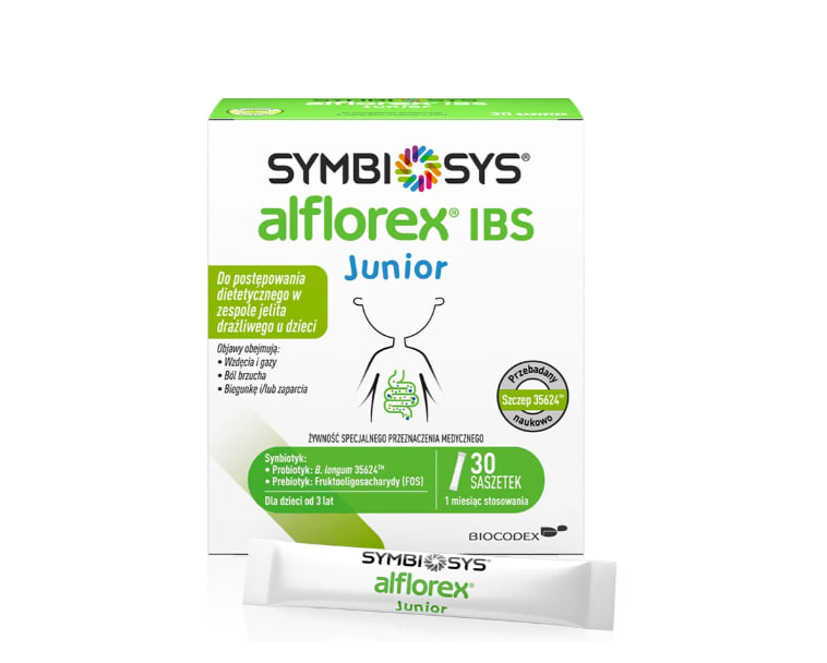Описание продукта Symbiosys® Alflorex IBS Junior — это пищевой продукт специального медицинского назначения в форме порошка в пакетиках , разработанный для поддержки диетического питания детей от 3 лет с целью облегчения симптомов синдрома раздраженного кишечника (СРК) , таких как: вздутие живота и газы, боли в животе, диарея и/или запор. Symbiosys ® Alflorex IBS Junior — синбиотический продукт , содержащий комбинацию пробиотика — селекционированного штамма бактерий Bifidobacterium longum 35624™ — с пребиотиком — фруктоолигосахаридами (ФОС). Клинически доказано, что штамм Bifidobacterium longum 35624™ облегчает симптомы СРК. Фруктоолигосахариды (ФОС) – растворимая клетчатка с пребиотическими свойствами. Пребиотики способствуют росту полезных кишечных бактерий, включая бифидобактерии. Благодаря ферментации в короткоцепочечные жирные кислоты они поддерживают пищеварительную и метаболическую функции.