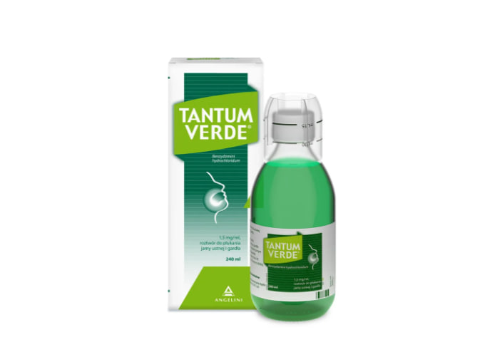 Описание продукта Тантум Верде — это ополаскиватель для полости рта с приятным сладким мятным вкусом. Действующее вещество — бензидамин, нестероидный противовоспалительный препарат (НПВП). Он обладает противовоспалительными, обезболивающими и антисептическими свойствами, уменьшая заложенность и отёк полости рта и горла .
