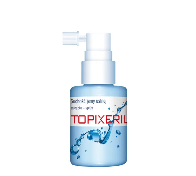 Приложение Топиксерил, молочный спрей от сухости во рту, 40 мл - когда применять? В случае ксеростомии — сухости слизистых оболочек рта и горла — независимо от ее причины, особенно в случае сухости во рту, вызванной: лучевая терапия, химиотерапия при раке, применение лекарственных препаратов, описанным побочным эффектом которых является развитие сухости в полости рта. использование протезных реставраций, в случаях, связанных с возрастом или клиническим состоянием (паллиативная помощь), в ходе инфекции и раздражения слизистой оболочки рта и горла. Топиксерил можно применять в профилактических целях людям, подверженным воздействию вредных и раздражающих факторов, таких как табачный дым, чрезмерно сухой воздух (связанный с отоплением или кондиционированием воздуха в помещениях или пребыванием в климатической зоне с сухим и жарким воздухом).