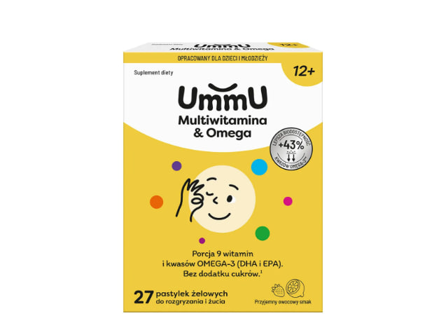 Описание продукта UmmU Multivitamin & Omega 12+ — это пищевая добавка, предназначенная для детей старше 12 лет. Она содержит смесь витаминов , омега-3 жирных кислот (ДГК и ЭПК) и холина , все это в удобных жевательных леденцах с фруктовым вкусом. Как действуют ингредиенты UmmU Multivitamin & Omega 12+? ДГК (докозагексаеновая кислота) – поддерживает нормальную работу головного мозга и способствует нормальному зрению (благотворный эффект достигается при ежедневном приеме 250 мг ДГК). ЭПК и ДГК способствуют нормальному функционированию сердца (благотворный эффект достигается при ежедневном приеме 250 мг ЭПК и ДГК). Витамин С – поддерживает иммунную систему, способствует снижению усталости и утомления, поддерживает выработку коллагена для правильного функционирования кожи и десен. Витамин D поддерживает работу иммунной системы и помогает сохранять здоровье костей и зубов. Витамин А помогает поддерживать нормальное зрение и способствует здоровью кожи. Витамин Е защищает клетки от окислительного стресса. Витамины группы В (В6, В12, биотин , фолиевая кислота) – поддерживают нервную систему и психологические функции, способствуют энергетическому обмену. Биотин помогает поддерживать здоровье кожи и волос. Холин способствует правильному метаболизму жиров и поддерживает функцию печени.