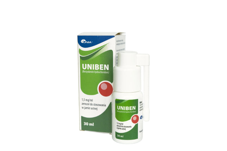 Как использовать Юнибен? При первом использовании несколько раз энергично нажмите на дозатор. Поверните наконечник дозатора так, чтобы он принял горизонтальное положение. Направьте кончик дозатора в рот. Плотно нажмите на дозатор большим или указательным пальцем. Повторите действие необходимое количество раз в соответствии с рекомендуемой дозировкой. Этот препарат не следует принимать дольше 7 дней, и решение о продлении курса лечения принимает ваш врач. Если ваши симптомы ухудшаются или не улучшаются после 7 дней приема «Юнибена», обратитесь к врачу. Противопоказания Аллергия (гиперчувствительность) к гидрохлориду бензидамина или любому другому компоненту данного препарата.