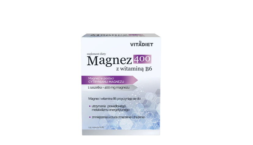 Описание продукта Vitadiet Magnesium 400 с витамином B6 — это биологически активная добавка в пакетиках для взрослых. Рекомендуемая суточная доза содержит 400 мг магния и 1,4 мг витамина B6. Что делает добавку Vitadiet уникальной? Магний в форме цитрата магния + витамин В6 в форме пиридоксина гидрохлорида. 400 мг ионов магния и 1,4 мг витамина В6 в 1 пакетике.