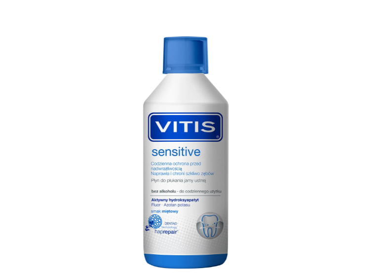 Описание продукта Ополаскиватель для полости рта Vitis Sensitive разработан в дополнение к ежедневной гигиене для людей с чувствительными деснами. Он также хорошо помогает снизить чувствительность после стоматологических процедур. Формула этого жидкого средства обладает двойным действием: она восстанавливает и уменьшает повышенную чувствительность. Технология DENTAID harprepair основана на наночастицах гидроксиапатита, природных строительных блоках зубов, которые интегрируются в поверхность эмали (запечатывают дентинные канальцы), создавая защитный слой, предотвращающий передачу внешних раздражителей. Нитрат калия подавляет передачу внешних раздражителей к нервным окончаниям, снимая неприятную и раздражающую боль. Узнайте о составе жидкого средства Vitis Sensitive. Гидроксиапатит 0,0125% – герметизирует дентинные канальцы, создает прочное покрытие и снижает гиперчувствительность. В сочетании с фтором повышает устойчивость зубов к кариесу. Нитрат калия 1% – снижает возбудимость нервов, облегчает боль. Монофторфосфат натрия 226 ppm – реминерализует эмаль, защищает зубы от эрозии. Провитамин B5 0,5% – увлажняет, успокаивает раздражения, регенерирует слизистые оболочки. Аллантоин 0,1% – обладает увлажняющим, успокаивающим, регенерирующим и противовоспалительным действием.