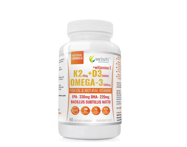 Описание продукта Wish K2 50 мкг + D3 2000 МЕ + Омега-3 1000 мг + витамин E — это пищевая добавка, предназначенная для взрослых. В состав препарата входят витамины: витамин К в форме менахинона-7 из сои, витамин D, витамин Е; и жирные кислоты Омега-3: Эйкозапентаеновая кислота (ЭПК-кислота), ДГК (докозагексаеновая кислота). Wish K2 50 мкг + D3 2000 МЕ + Омега-3 1000 мг - действие Витамин К способствует нормальному свертыванию крови и, подобно витамину D, помогает поддерживать здоровье костей . Кроме того, витамин D поддерживает правильное усвоение кальция и фосфора и помогает поддерживать нормальный уровень кальция в крови. Он также участвует в процессе деления клеток и играет роль в нормальной работе мышц. Витамин Е помогает защитить клетки от окислительного стресса. ДГК способствует поддержанию нормального зрения и нормальной работы мозга*. Биологически активная добавка Wish выпускается в виде мягких капсул с темной оболочкой, содержащих рыбий жир. Она не содержит глютена, соли, сахара, дрожжей и молочных продуктов. *Благотворный эффект достигается при ежедневном приеме 250 мг ДГК.