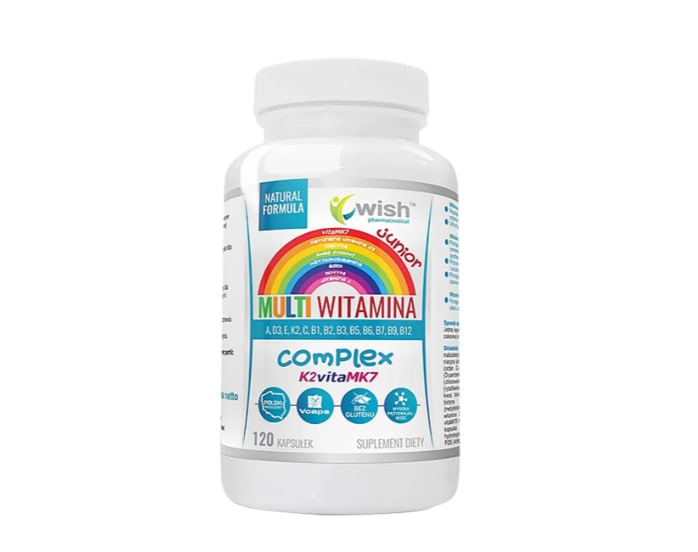 Описание продукта Wish Multivitamin Complex Junior K2vitaMK7 — это пищевая добавка, предназначенная для детей старше 10 лет. Она выпускается в форме капсул, и упаковки, содержащей 120 капсул, достаточно для восполнения дефицита питательных веществ в течение 120 дней (рекомендуемая суточная доза — 1 капсула). Что входит в состав мультивитаминного комплекса Wish Multivitamin Complex Junior? Биологически активная добавка для детей содержит 8 витаминов группы В : тиамин, рибофлавин, ниацин, пантотеновая кислота, витамин В6, биотин, фолиевая кислота, витамин В12. Он также обогащен витаминами К, С, Е, А, D и пребиотиком фруктоолигосахаридами (ФОС). Активные ингредиенты заключены в запатентованные капсулы Vcaps® , которые не содержат синтетических вспомогательных веществ, консервантов, дополнительных ароматизаторов и красителей.